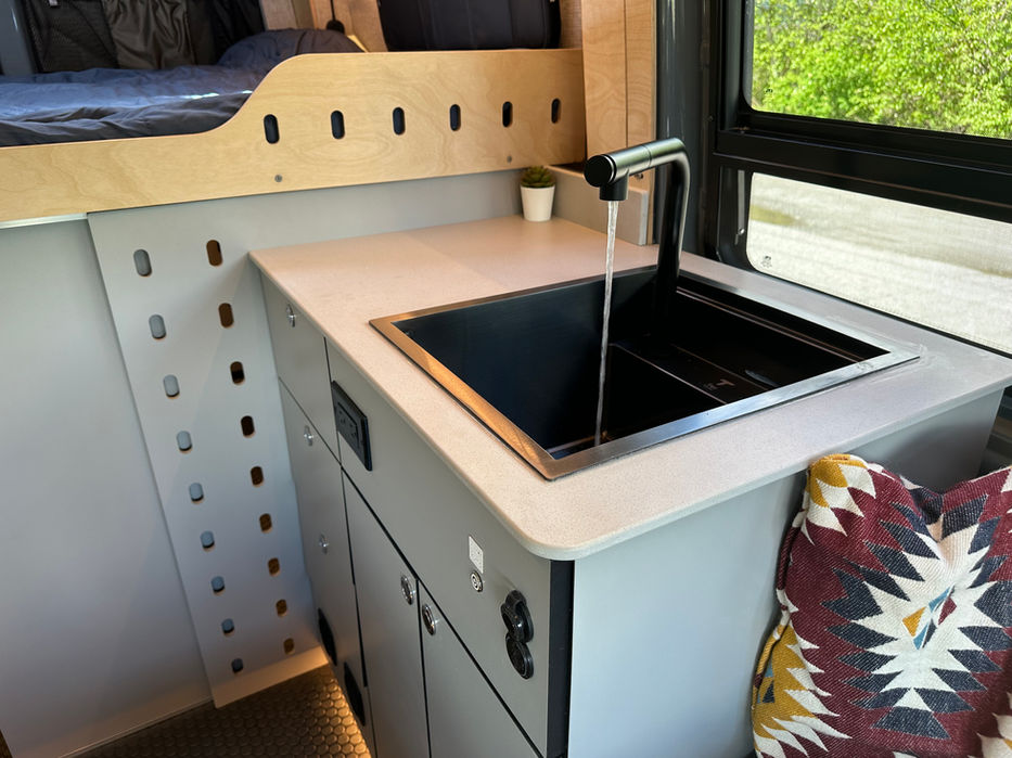 Custom grey water tank with bypass valve and hose drain for easy draining and maintenance.